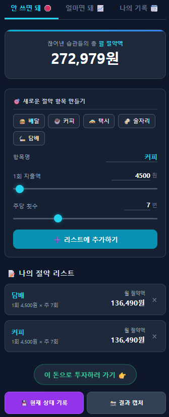 말씀드린 것처럼 "내 오늘 아낀 치킨값이 미래에 얼마가 될까?" 궁금하신 분들이 많으실 텐데요. 제가 최근에 이런 동기부여를 위해 직접 [안 쓰면 돼 & 얼마면 돼] 계산기를 만들었습니다!